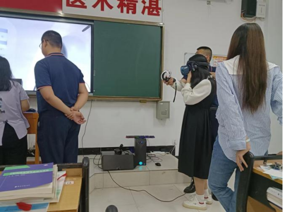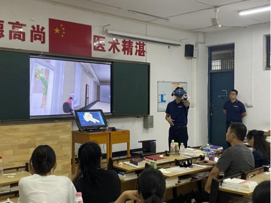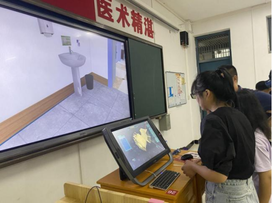 公司的技术人员讲解了桌面VR设备虚拟仿真体验及医学影像实训中心元宇宙建设,并带学生亲身体验沉浸式VR设备、桌面VR设备、混合现实VR设备。通过VR 沉浸式体验带学生进入医学影像放射科虚拟场景,让学生对医院医学影像中心布局及设备功能有真实体验理解,更具沉浸感,接近了真实的环境,从中学习了相关知识和技术。