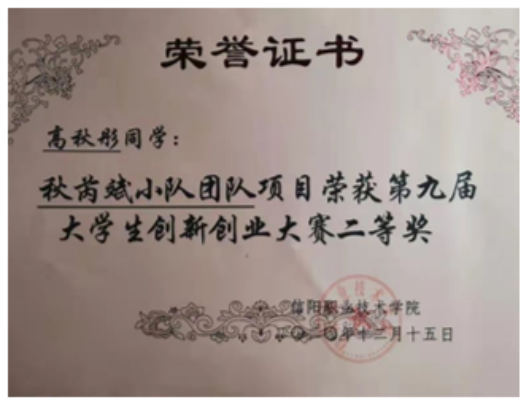 全国高等职业院校“发明杯”大学生创新创业大赛,获一等奖2项、二等奖4项、三等奖4项